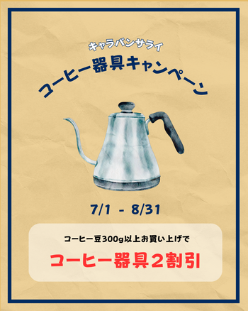 こんにちは、本店です?7/1から夏の【器具キャンペーン】開催します?期間:7/1(火)~8/31(日)期間中、コーヒー豆を300g以上購入でコーヒー器具が2割···